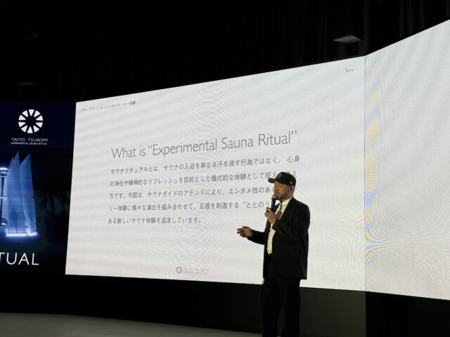 万博サウナの総合プロデューサー”サウナ師匠”こと秋山大輔氏が強調したのは、「EXPERIMENTAL SAUNA RITUAL」。「ととのう」では表現できない唯一無二の”体験”が構築されている。