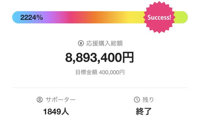 目標金額400,000円に対して、達成率2,000%を超える8,893,400円の支援が集まった(2025年9月現在)。