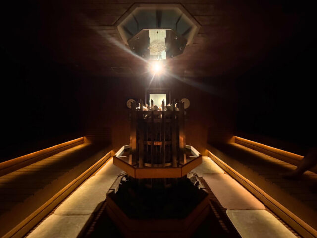 メインサウナは最大約40名収容の大箱。室温は約100℃級までしっかり上がる上、熱波のサービスで、追加の刺激までもらえる。