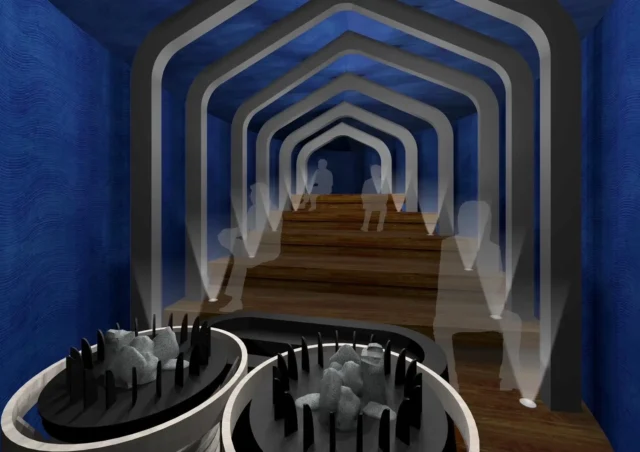通常のリクライニングチェアやベンチとは異なる、水の浮力を利用した休憩体験は、鯨が深海を漂うような感覚を再現している。暗がりの空間と相まって、深い瞑想状態に入れる特別な環境だ。