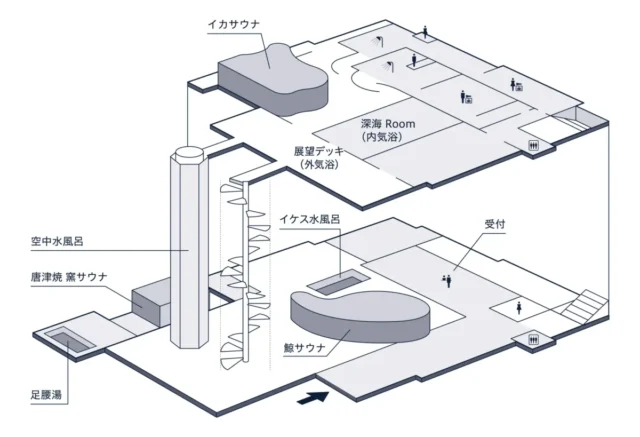 サウナ王・太田広氏がサウナエリアの監修を手掛け、日本初・九州初となる設備や演出を随所に取り入れた。鯨の潮吹きを再現した「潮吹きロウリュ」、空に浮かぶガラス張りの「空中水風呂」、日本のサウナ施設初となるウォーターベッド完備の「深海ルーム」など、呼子ならではの海の魅力を”深世界体験”として提供する。