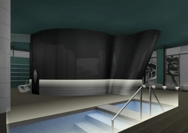 高低差のある座面と海中を思わせるアンビエントサウンド、EOS社「Shark」サウナストーブ2基を設置した本格仕様だ。鯨が潮を吹くダイナミックな自然現象を、サウナ体験として再現した革新的な演出となっている。