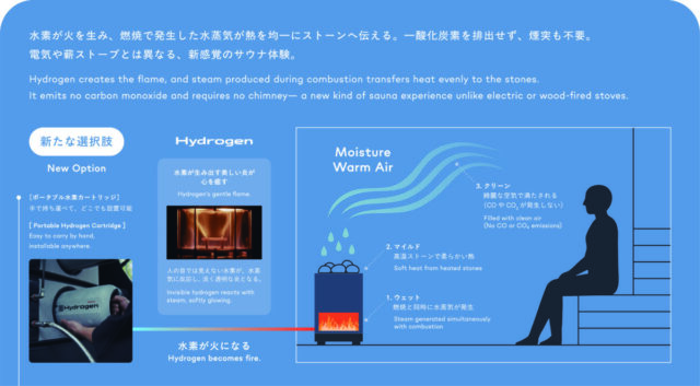 水素サウナの構造は言うまでもないが、水素の燃焼によって生まれるのは水のみ。一酸化炭素も排出せず、サウナ室にあるCO2はサウナーの呼吸から出るものだけだ。つまり環境負荷を大幅に減少させたサウナの構造といえる。