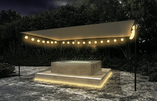 当館のアウトドアサウナは『リゾート×サウナ』をコンセプトに掲げ、敷地を活かした空間設計となっている。無数のストリングライトが装飾された新しいアクアゾーンは、夜になると煌びやかな光が水面に反射し、幻想的な雰囲気を演出する。昼は開放的に、夜はロマンティックに。時間帯によって異なる表情をお楽しみいただける仕様だ。