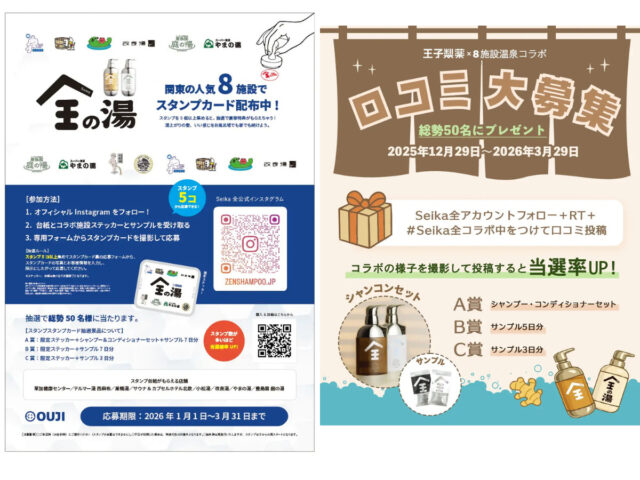 王子製薬株式会社(東京都渋谷区神宮前)は、ヘアケアブランド「Seika全(セイカゼン)」と関東の人気温浴施設8施設とのコラボレーションイベントを開催します。開催期間は2025年12月29日(月)〜2026年3月18日(水)までの約3ヶ月間です。