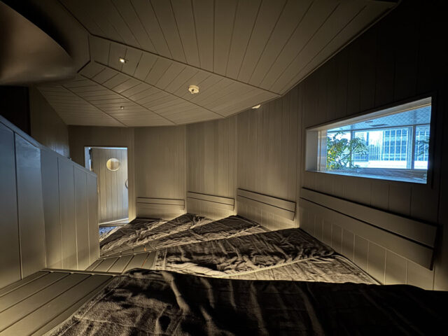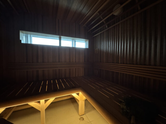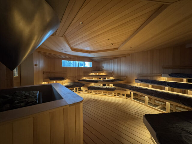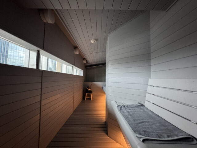 アウフグースなどのプログラムに対応した最大40名収容可能なサウナ室だ。ハイレゾ対応の高音質なサウンドシステムを搭載した。音と蒸気に溶け込むような体験が可能になっている。