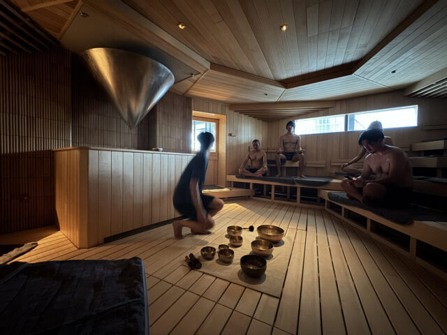 サウナ室で響くシンギングボウルの倍音は、熱と音の振動が融合する非日常の体験を生み出す。その豊かな音色は脳を深い瞑想状態へ導く。心身に究極の休息と解放感をもたらすプログラムである。