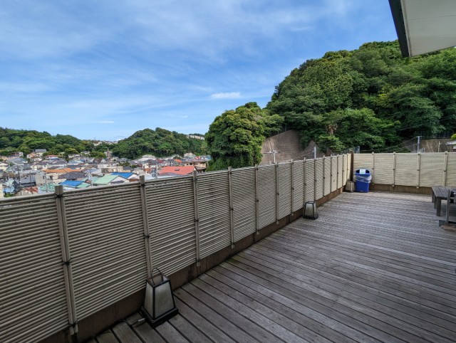 屋外休憩 | 喫煙所を併設した屋外休憩所。当施設は高台にあるので、衣笠の街並みが一望できる。 |