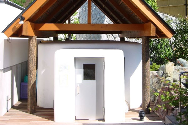 釜風呂は摂氏48~50℃で適度な湿度の蒸気風呂で、一般のサウナのように息苦しさがなく、人により10~15分程度静かに横臥すると汗が玉をつづるように快く流れ、盛んな新陳代謝を促します。 その後、白湯で汗を流す爽快さはこの上ありません。 手頃な湯治場として古来より、体を使わず、筋肉の疲れなく汗をかく方法と利用され今日に至っています