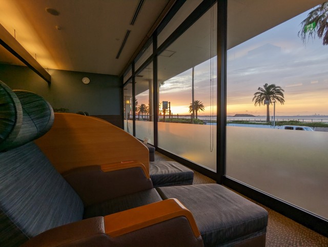 休憩スペース | コンセントあり | リクライニングエリアが主な休憩スペース。東京湾を一望しながらくつろぐことができ、各リクライニングにはUSBコンセントが配備。漫画はないが、雑誌が用意されている。 |
