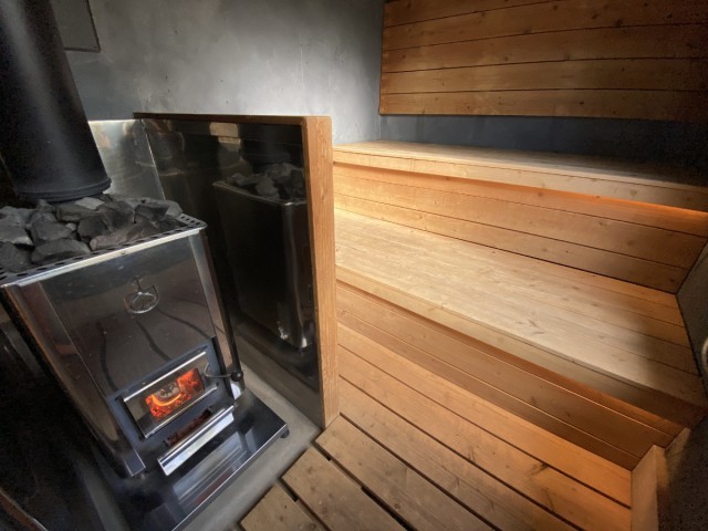薪ストーブメーカー「モキ製作所」の本気のサウナストーブで、コンパクトなのに高火力でしっかりと温まる。 また、セルフロウリュで好みの温度まで調節可能。