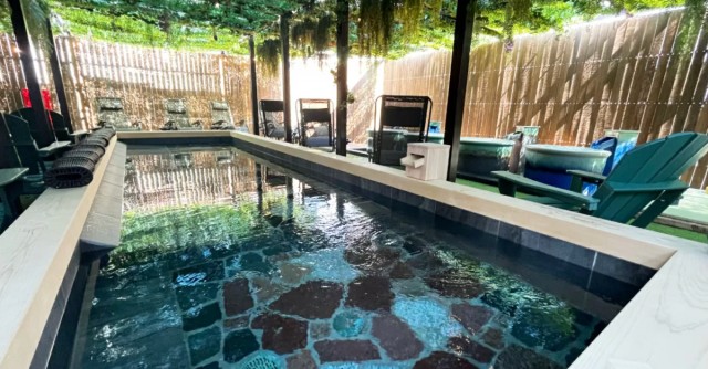 プールのような深い水風呂。頭までかけ水してしっかり汗を流せば、潜水OK 。シングルもあるので、冷冷交代浴にピッタリ。肌触りにストレスが少ないナノ水を使用。