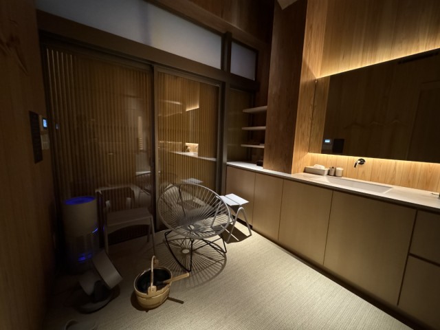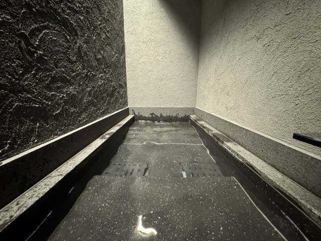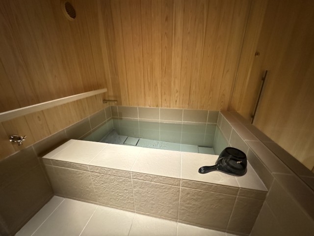 最大2名、男女別の個室サウナ。サウナ室は黒い漆喰でシック。寝水風呂があるのが特徴。内気浴エリアはROOM1より広く、天井も高い。黒を基調にしたシックな浴室。