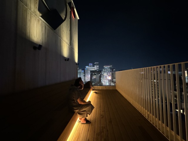 「INFINITY TERRACE」:大衆サウナエリアの12Fから階段で上がる屋上外気浴。デッキエリアに大きなベンチがあり、銀座の夜景が一望できる。屋上までの階段は柵1つで身を乗り出せば地上が丸見え。高所恐怖症は無理かもしれない。その分圧倒的な開放感がある。