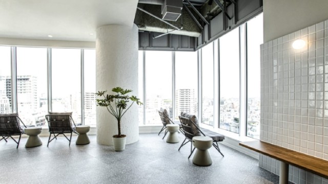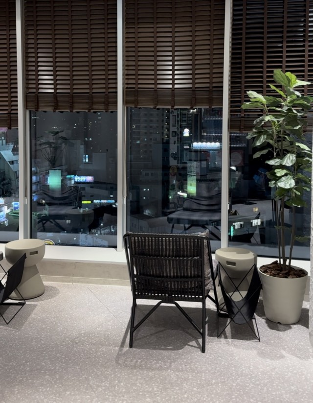 休憩スペース | コンセントあり | ・スカイラウンジ 受付と同じ階にラウンジを完備。充電可能なカウンター、リクライニングシートが数台。 窓に向かって椅子が並び、夜景も綺麗に見える。 |