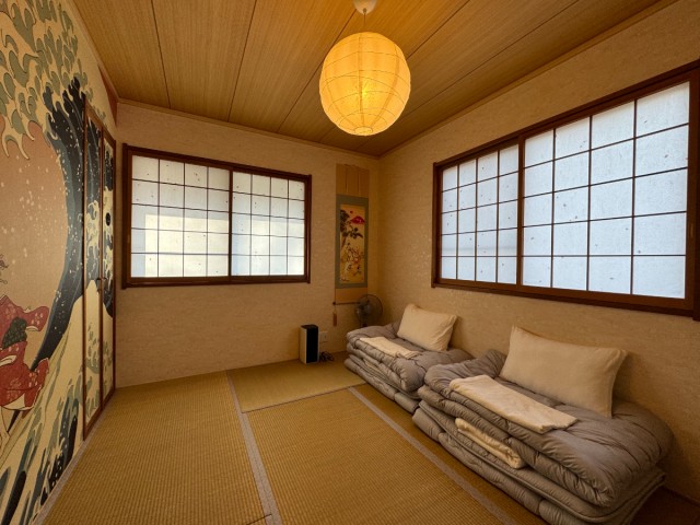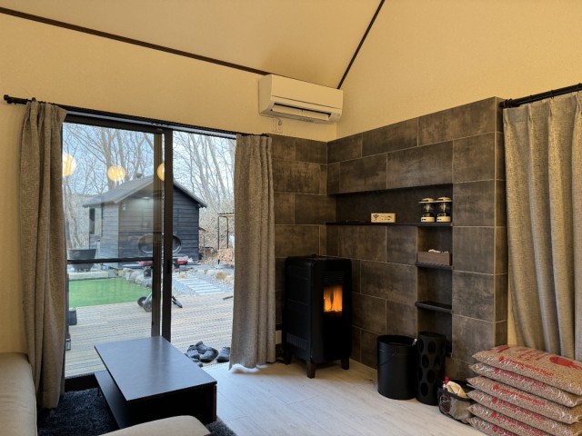 休憩スペース | コンセントあり | 1棟貸しの宿泊施設。リヴィング、和室、寝室を完備。ペレットタイプの暖炉をリビヴィングで使用できる。 |