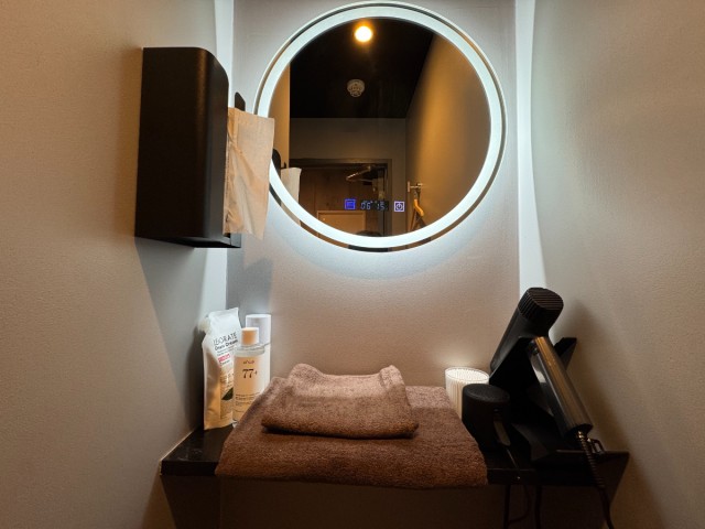 1人用|MIASストーブ|セルフロウリュ(5分毎・1回につき2杯まで) ・105度の設定。ドアを開ければ温度を下げれば調整は可能。 ・「族スイッチ」:ストーブ両脇のダクトから送風がくる。ロウリュ後に使用すると熱気や快感が増幅する。 全室、足置き付き、脚を伸ばしてサウナが可能。 サウナ室の構造は若干広さが違うだけで、同スペック。